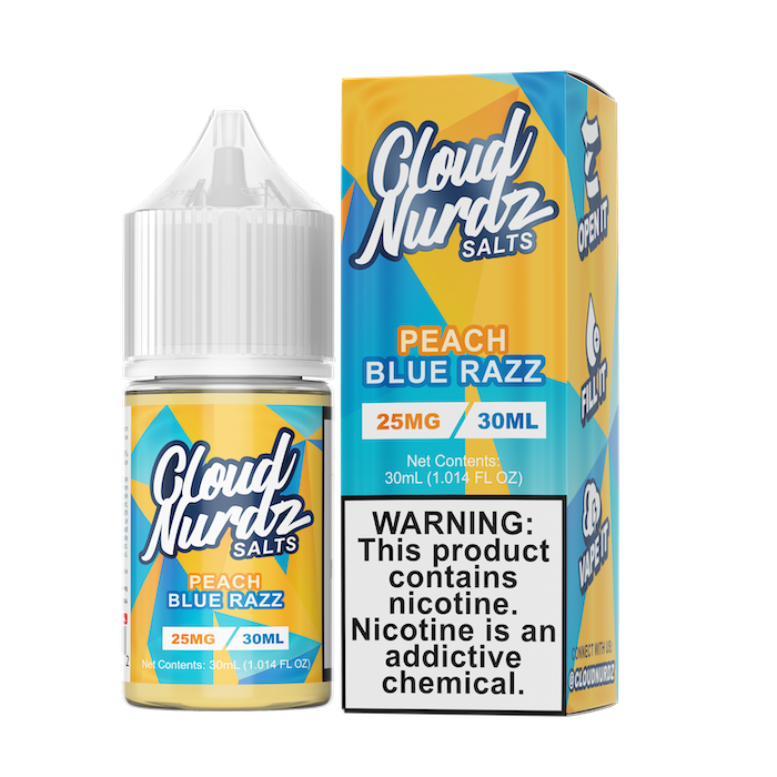 Cloud Nurdz - Peach Blue Razz Salts is a zesty mix of perfectly sweet southern peaches blended with the tanginess of blue raspberries to create an awesome tasting nic salt that will rock your mouth.